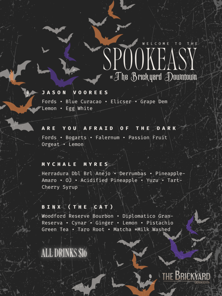 The Spookeasy haunts the Brickyard this Friday only. Start the night with a complimentary welcome punch courtesy of Brown-Forman while supplies last.
